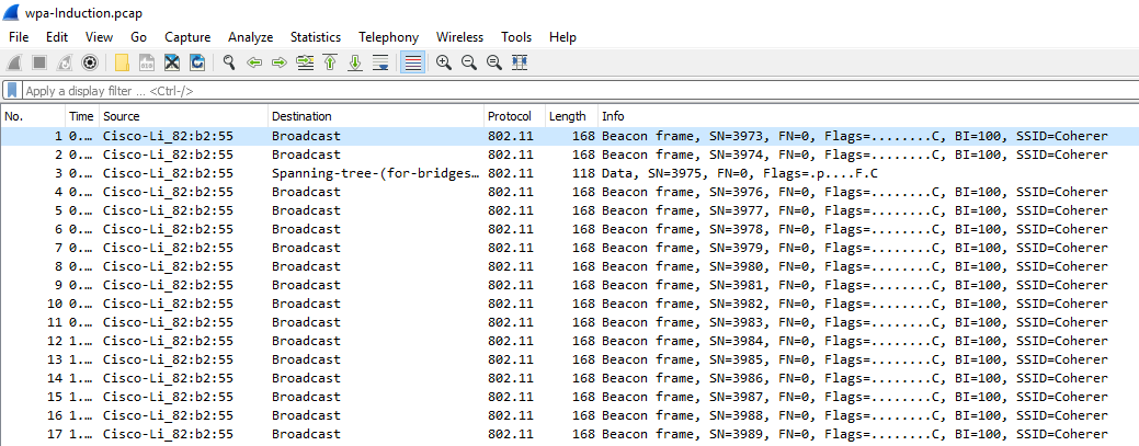 Při výchozím nastavení se nám budou ve WireSharku zobrazovat jen 802.11 rámce, což je logické, protože WireShark pro jejich rozšifrování nemá klíč (viz obrázek z příkladu).